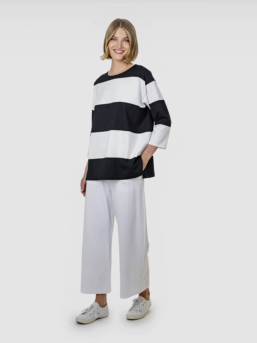 Se on valmistettu ryhdikkäästä musta-valkoraitaisesta viskoosineuloksesta, jossa on hieman elastaania joustoa antamassa. Vaatteen materiaali tuntuu erittäin miellyttävältä ihoa vasten. LORU-paita on suunniteltu Suomessa ja valmistettu Liettuassa.