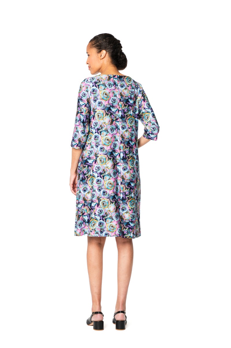 Fiorina-mekossa on kaunis malli: hieman vartaloa myötäilevä yläosa ja kellotettu helma. Mekossa on pyöristetty venepääntie ja vajaamittaiset hihat. Sivusaumoissa on kätevät taskut. Materiaali on miellyttävän pehmeää ja laskeutuvaa viskoositrikoota.
