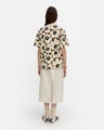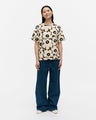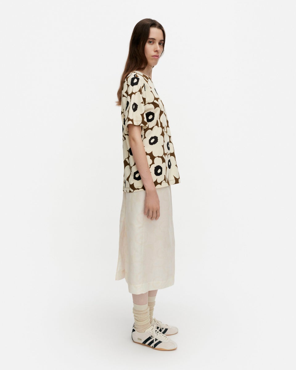 Tunnit-t-paita on valmistettu luomupuuvillatrikoosta, ja siinä on rento istuvuus, suora leikkaus sekä Unikko-kuosi. T-paidassa on omalla kankaalla viimeistelty pyöreä pääntie.